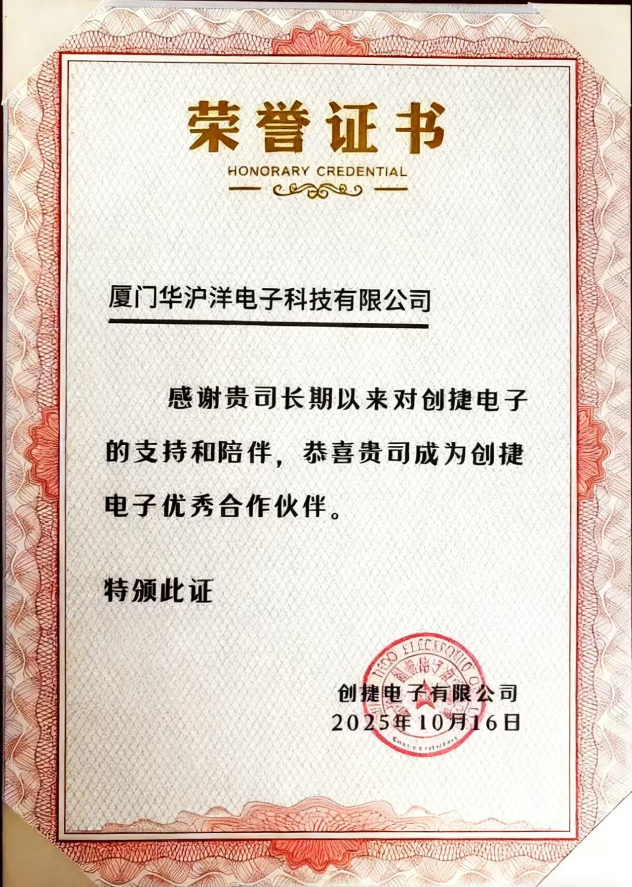 2025年10月16日我司凭借卓越的业绩表现与诚信效能,荣获创捷电子有限公司授予的“优秀合作伙伴”荣誉。